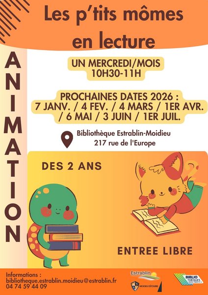 les prochaines dates des P’tits mômes en lecture seront les mercredi 7 janvier - 4 février- 4 mars - 1er avril - 6 mai - 3 juin et 1er juillet